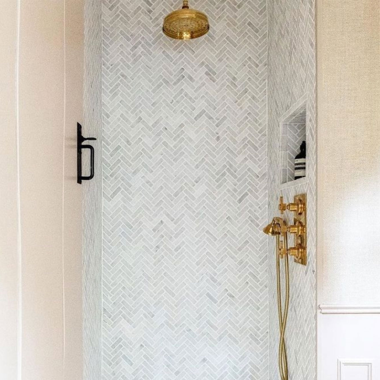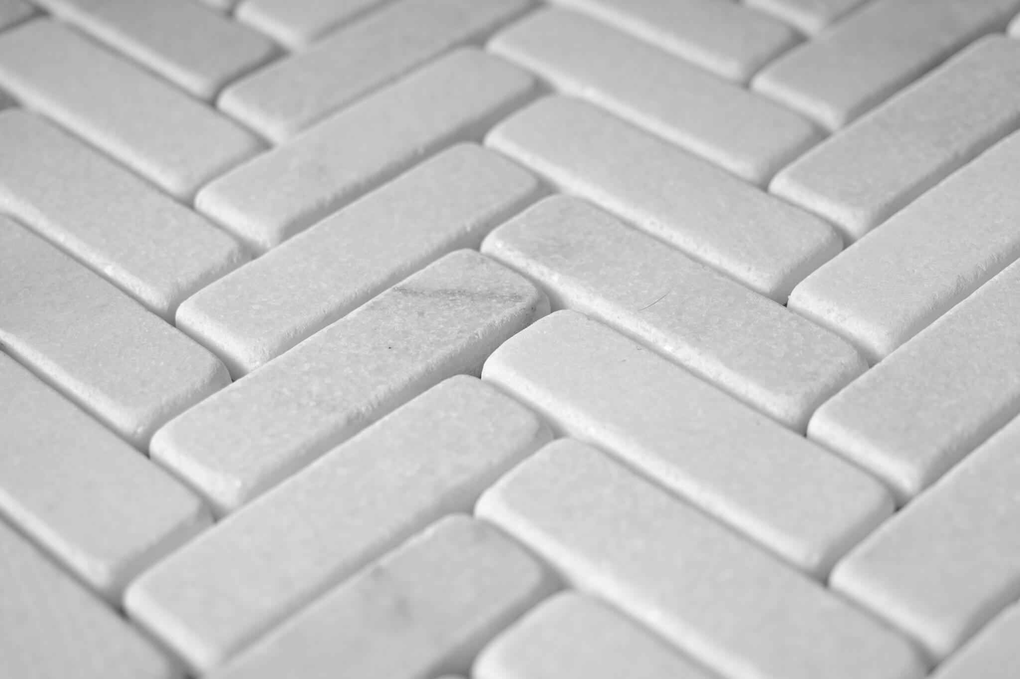Beautiful addition to the Aegean white marble collection, Tumbled Herringbones. Offered in smooth tumbled finish, ideal for wet room floors and walls. We recommend sealing all natural stone products.