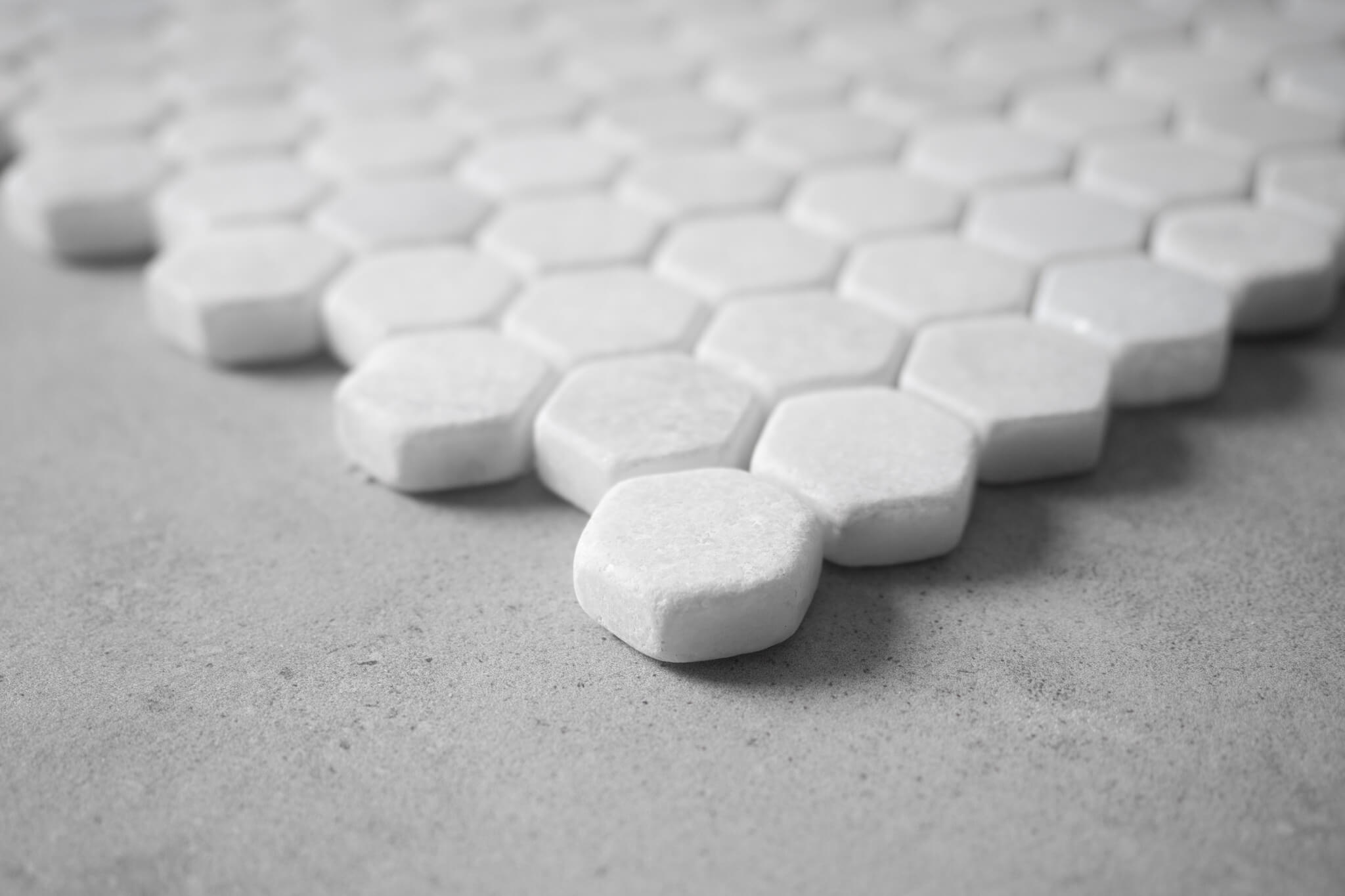 White Marble Tumbled Penny Hexagon Mosaic Tiles Our brand new size in Hexagon range, Penny hexagons. Offered in honed & tumbled finishes Aegean White Marble Penny Hexagons are a great choice for bathroom floors and walls. Suitable for wet areas and underfloor heating. All natural stone tiles are recommended to be sealed.