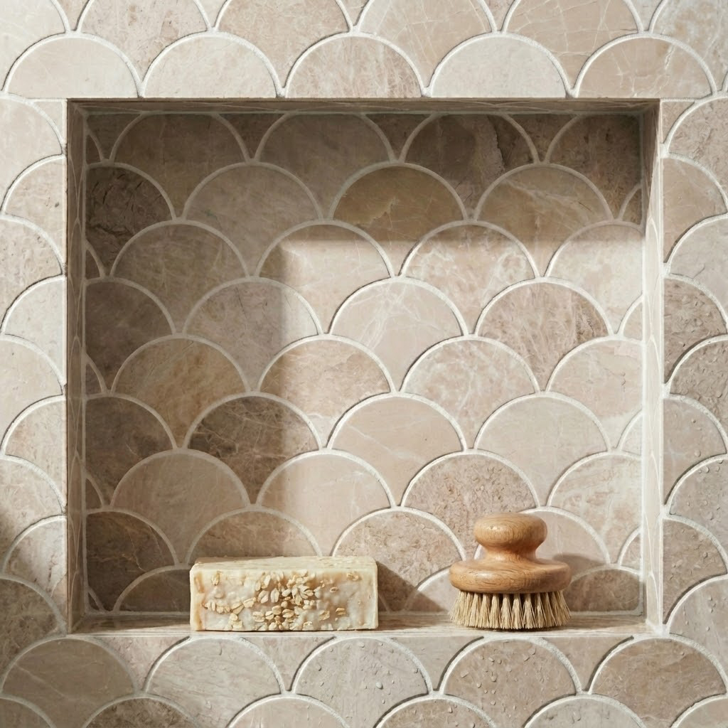 Belgravia marble scallop mosaic is an elegant and timeless decorative tile featuring interlocking scallop-shaped pieces made from premium marble. The mosaic pattern combines the natural beauty and variations of marble with a unique, eye-catching design that adds a sophisticated touch to interiors. It is commonly used for backsplashes, accent walls, and flooring in both residential and commercial spaces, enhancing the aesthetic appeal with its luxurious texture and intricate detailing.