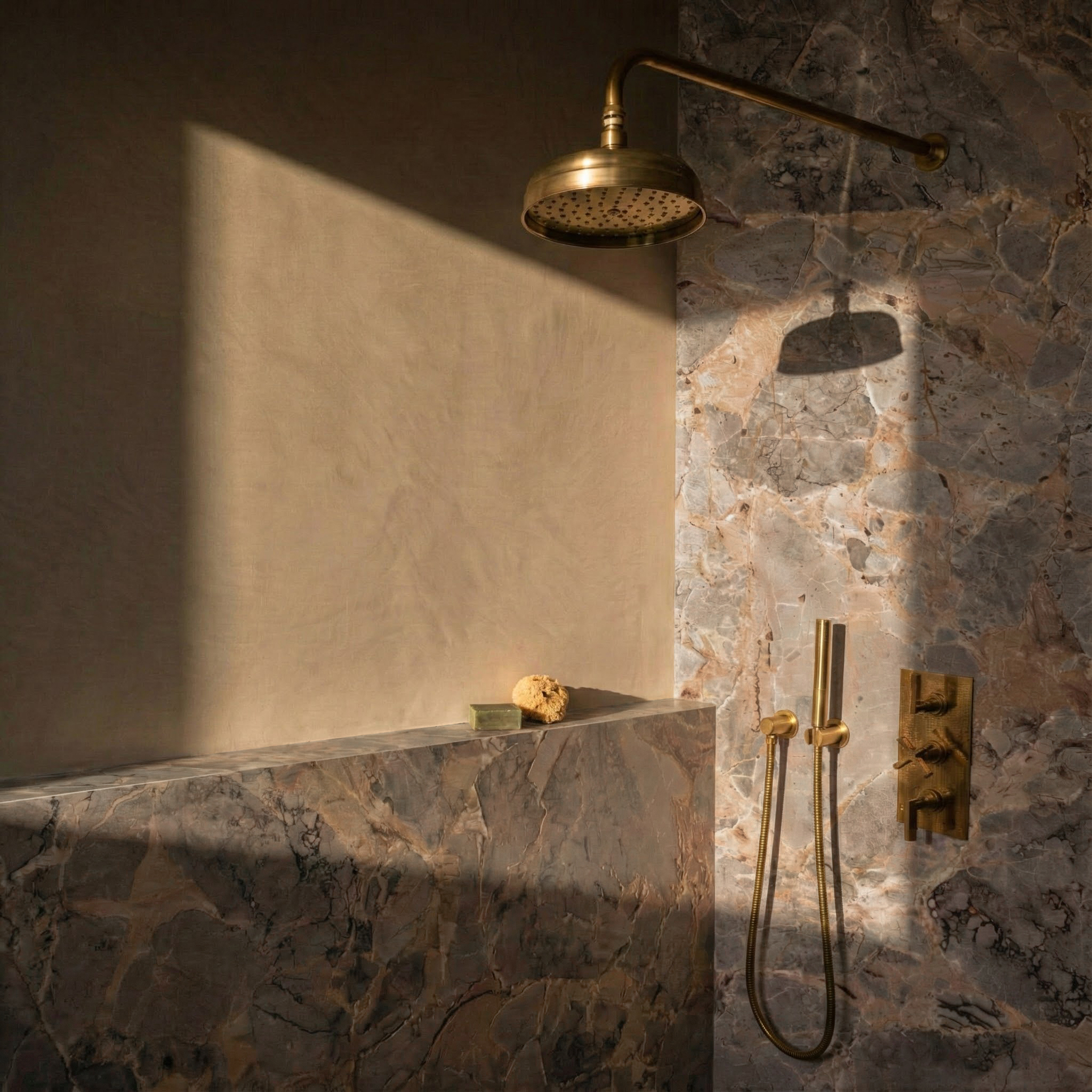 With its vibrant cluster like veins, Breccia Bruno marble is offered in textured leathered finish, ideal for your bathroom and kitchen applications.