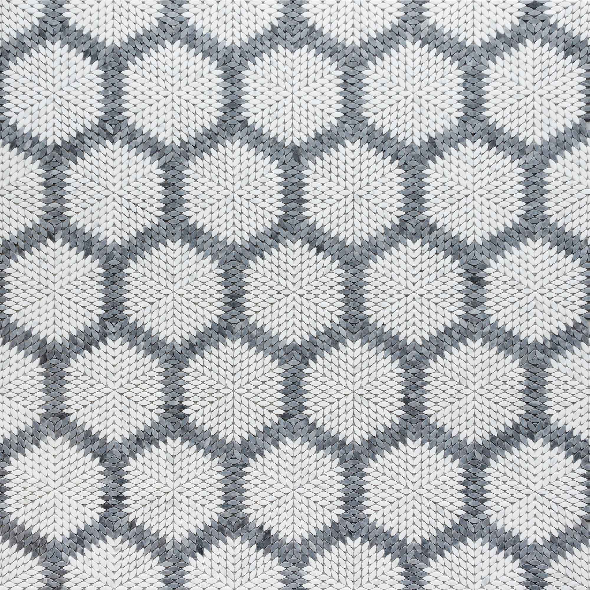 Beloved flower mosaic now offered in a large flower mosaic for larger pattern size. Offered in a white Calacatta & Bluestone marble.