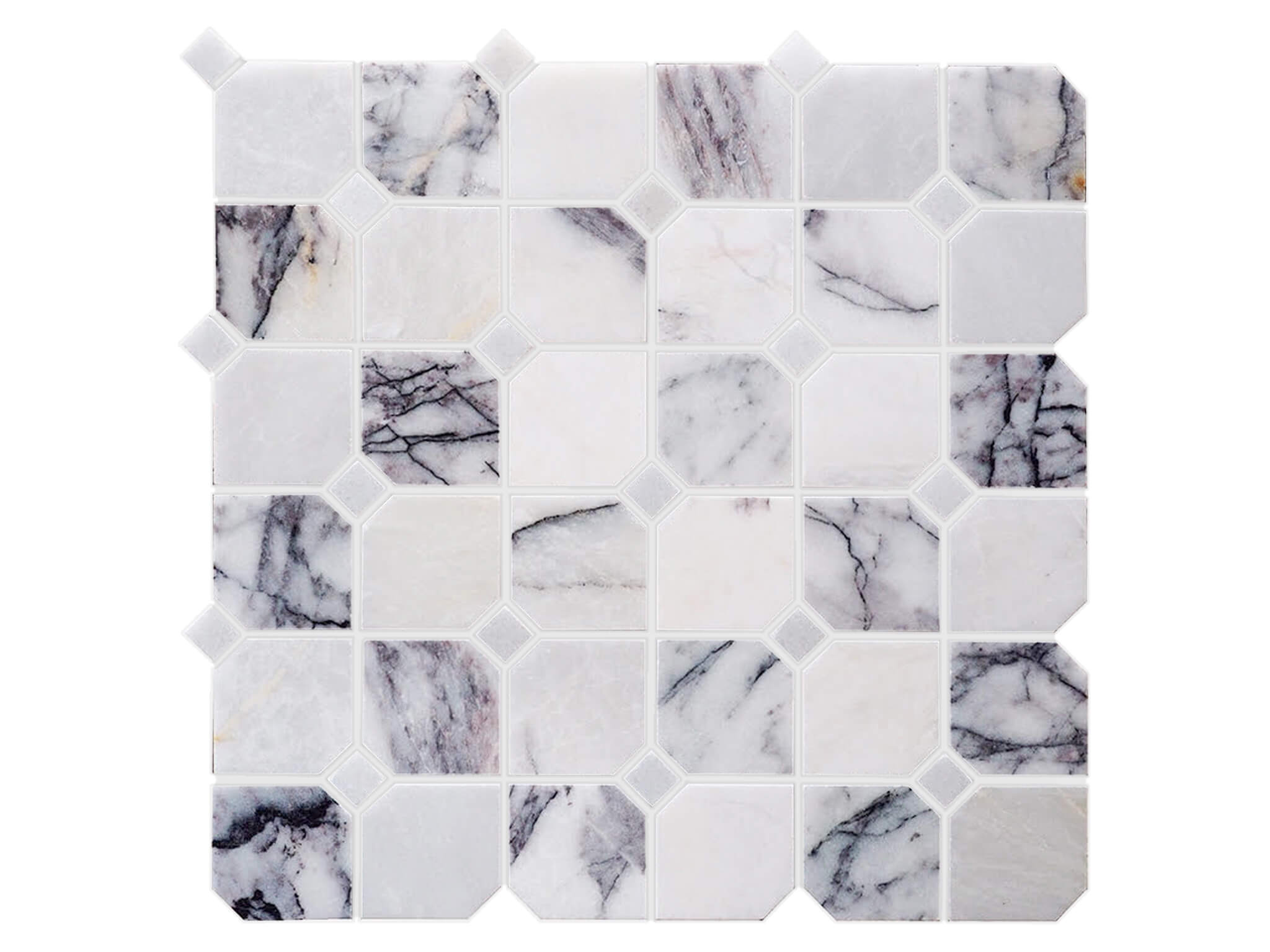 Lilac marble also known as Calacatta Viola is now offered in a round penny mosaic pattern. Ideal for wall and floor applications, Penny mosaic features s small penny size circle pieces