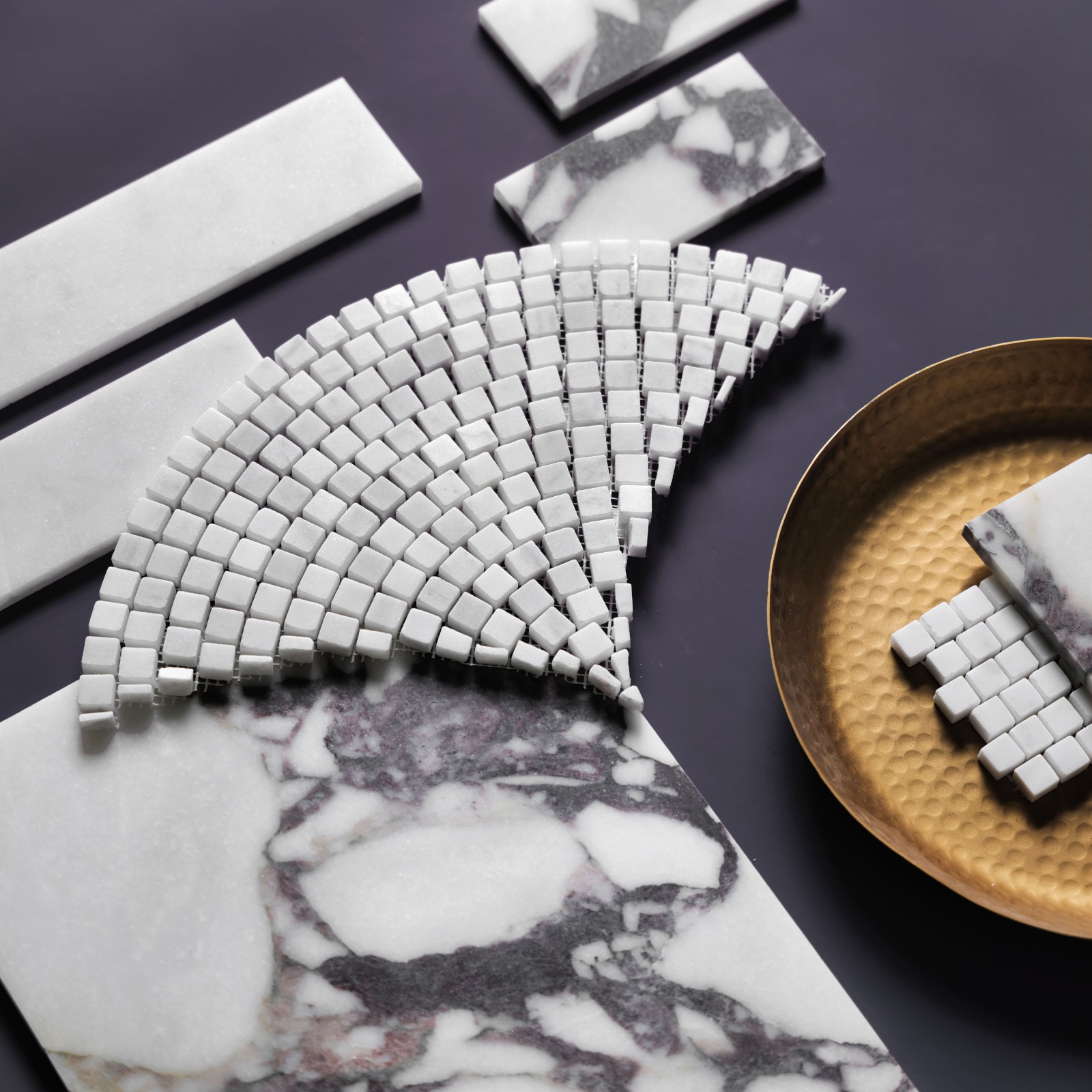 We are thrilled to present you with Calacatta White marble tiles in a Fan Scallop mosaic pattern. Fan tiles feature 15x15mm chip size pre-laid on a sheet in a large fan (scallop) tile shape. Inspired by classic Roman mosaics Mini Mosaic collection is truly unique. Mini Mosaic tiles are available in a variety of colour variations and patterns. Suitable for wet areas and underfloor heating. Marble tiles are suitable for indoor use, on both walls and floor surfaces. Please note that colours may differ in natural/artificial lighting. Sealing is recommended for all our natural stone products.