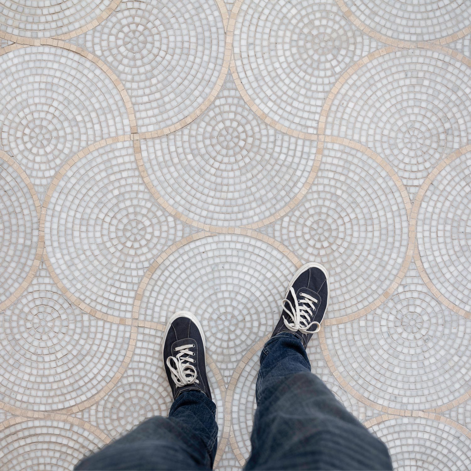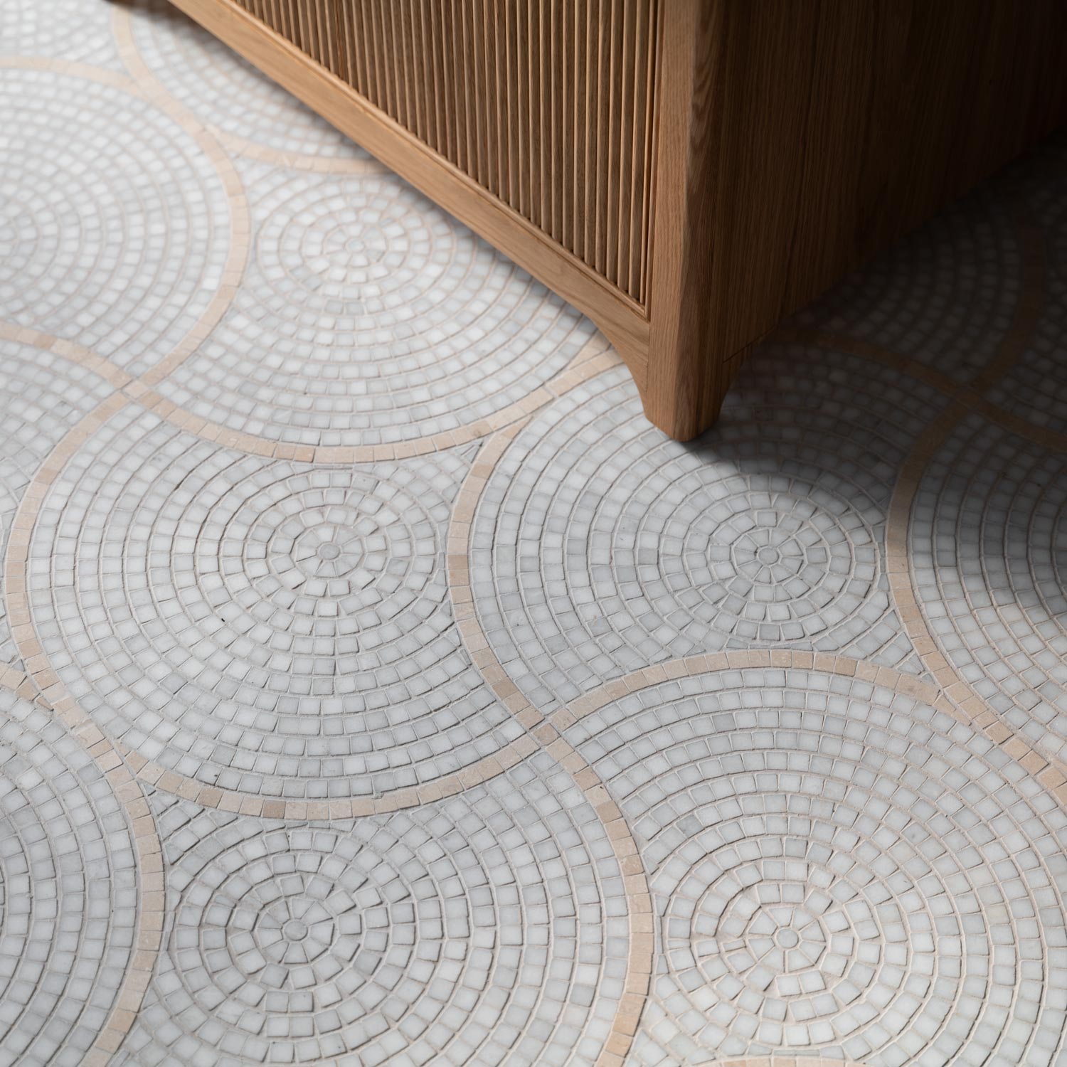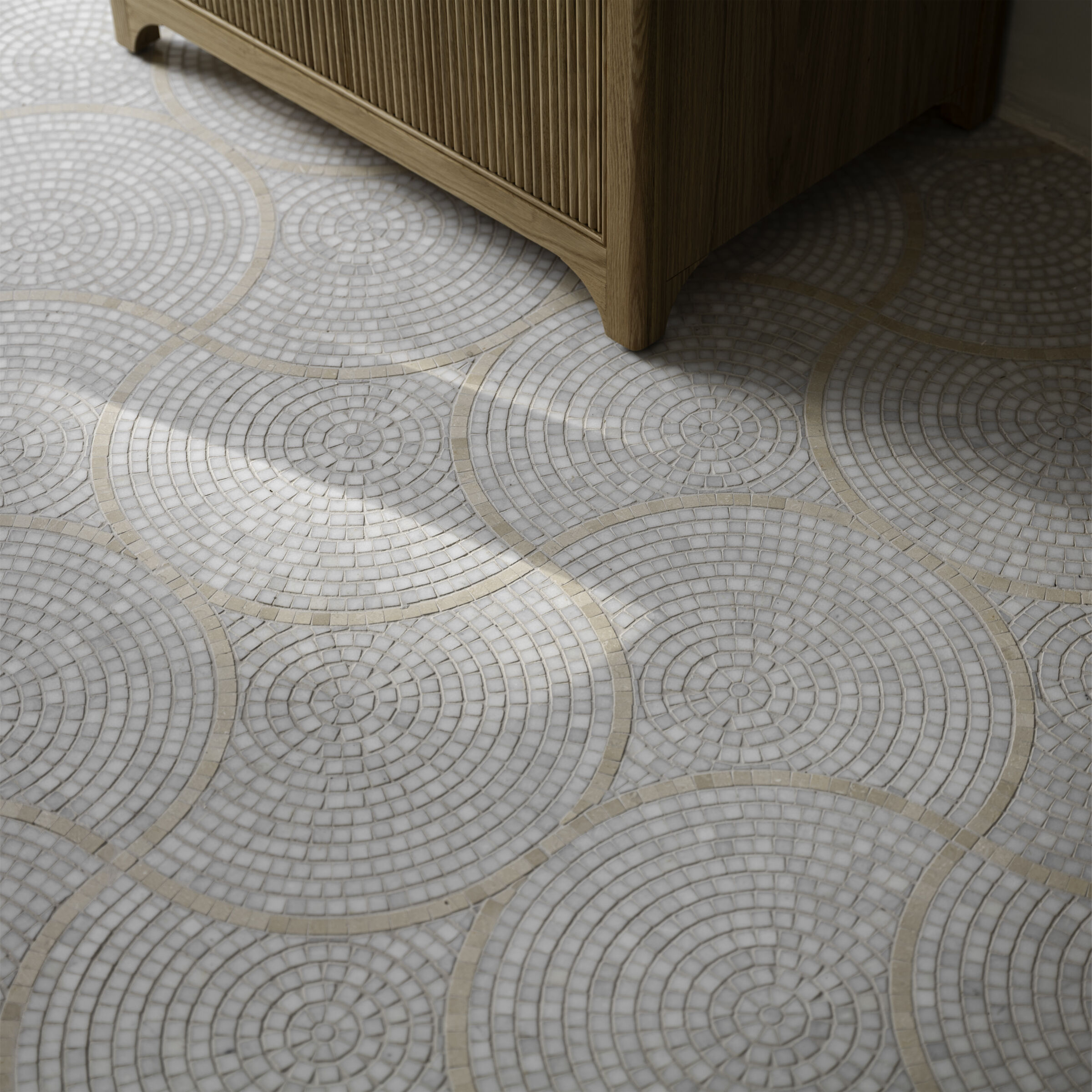 New Pompeii Fan mosaic is a beautifully crafted, handmade design inspired by the art of ancient Pompeii. It features a fan pattern, elegantly outlined with a soft beige border that adds warmth to the piece. The interior is a crisp white, providing a clean and classic contrast to the border. The fan motif radiates out in a series of delicate curves, evoking the sophistication of Roman-era decor. The meticulous arrangement of small, hand-cut marble tiles gives the piece a timeless, luxurious appeal, perfect for adding a touch of classical elegance to any setting.