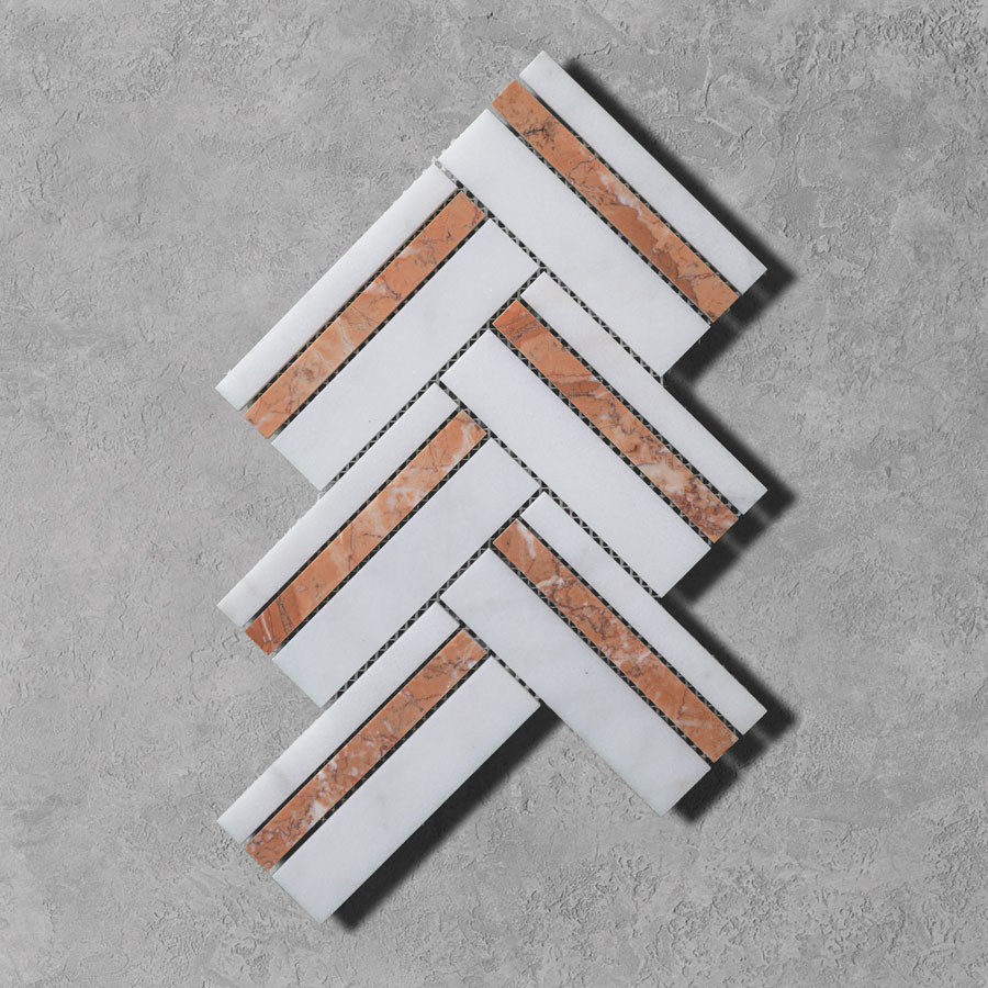 Introducing our new addition to Vivid Marble Mosaics range glamours Duo Herringbone tiles. Made of white Calacatta Pearl and peachy Rosso marble creating a contemporary and luxurious visual.