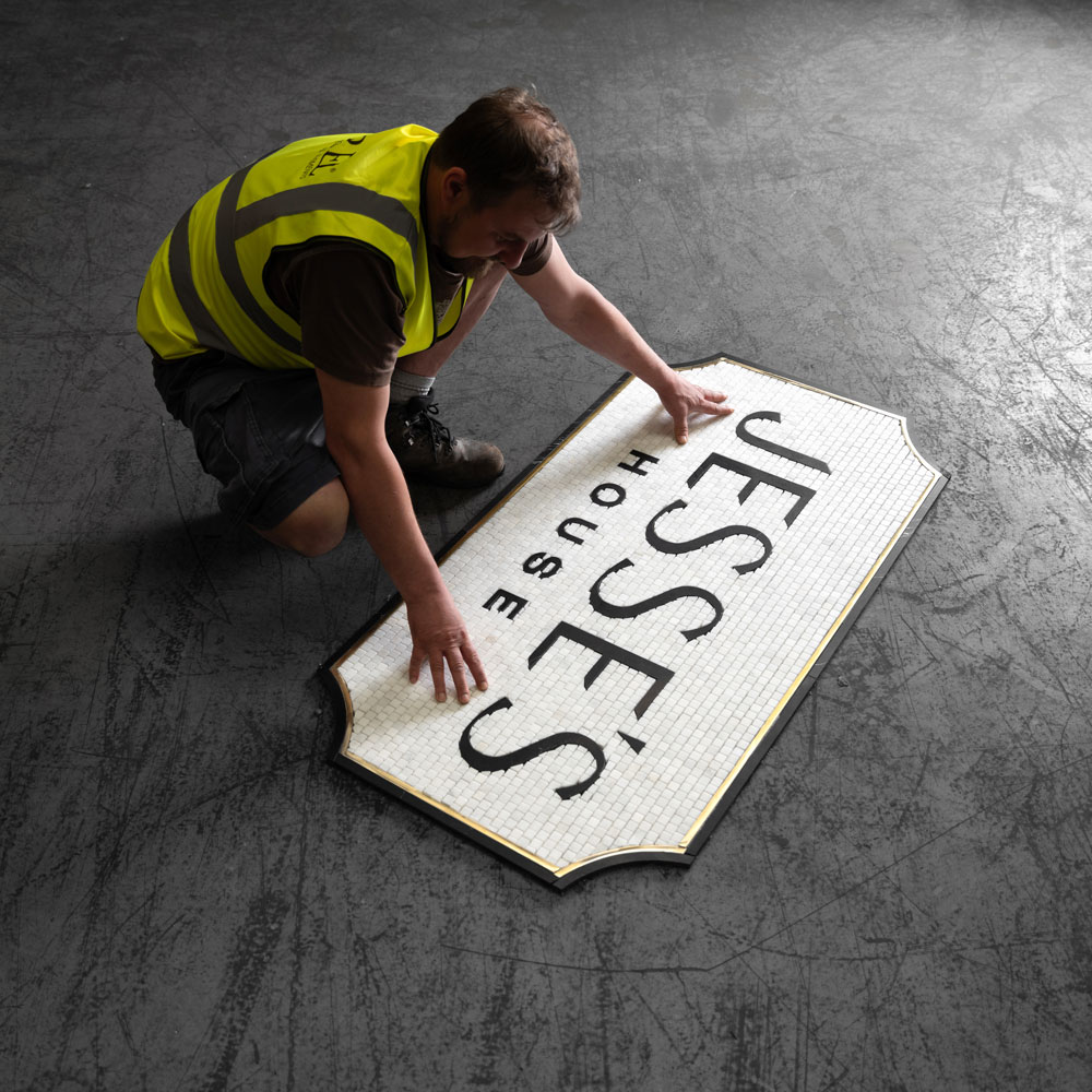 Handmade typographic entrance mosaics are intricate and personalized art pieces that adorn the entryways of homes, businesses, or public spaces. These mosaics are crafted with meticulous attention to detail, blending the ancient art of mosaic-making with contemporary typographic design. Please contact us with your typographic mosaic project on enquiries@starelstones.co.uk or call us on +44 (0) 1483 973477.