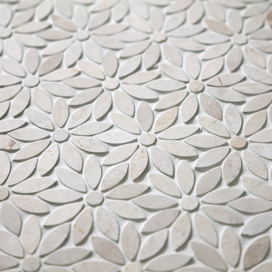 Funky and stylish, this white emperador marble flower mosaic is a showstopper. Suitable for walls and floors as well as underfloor heating and wet rooms. Ideal combination for other White Marble tiles and Mosaics.