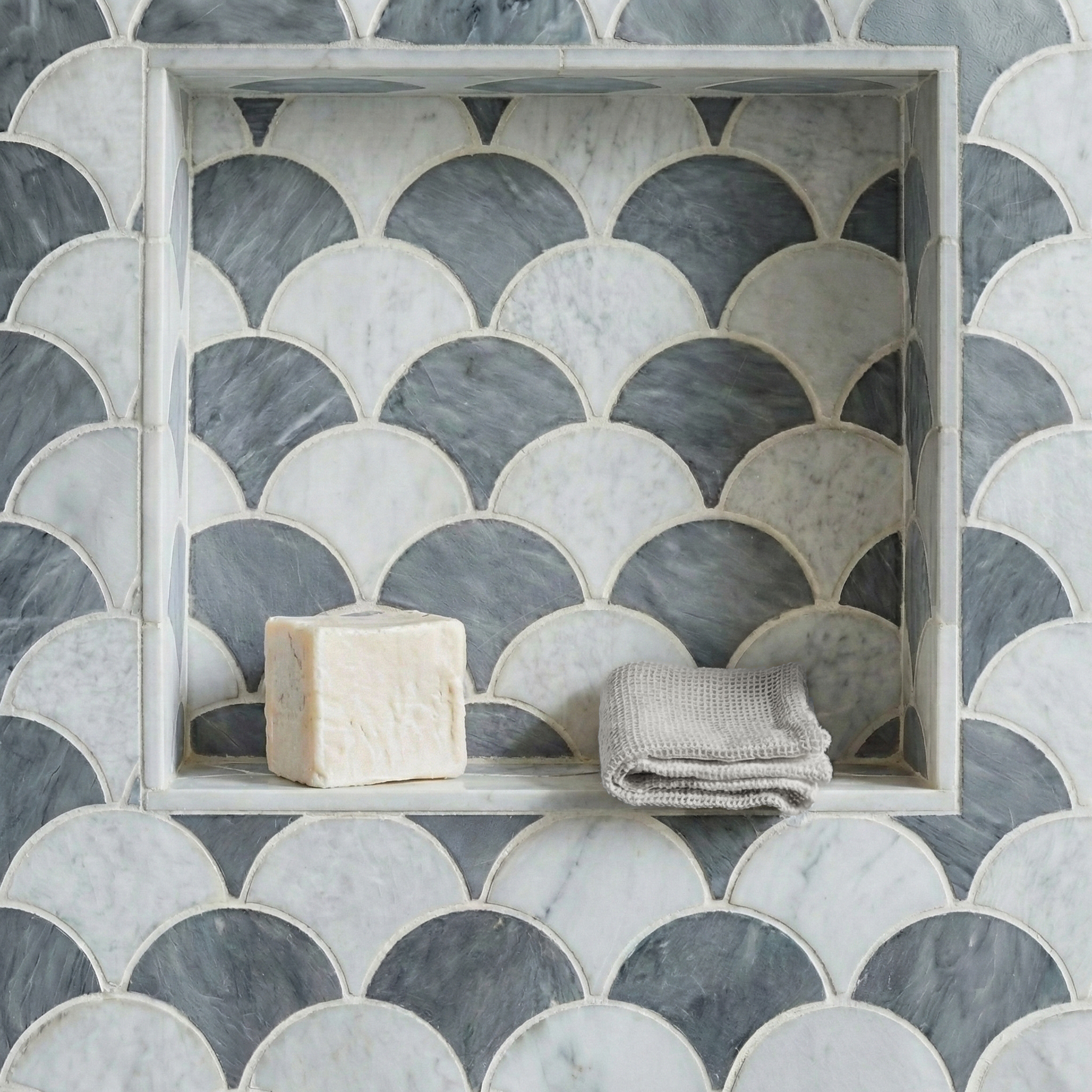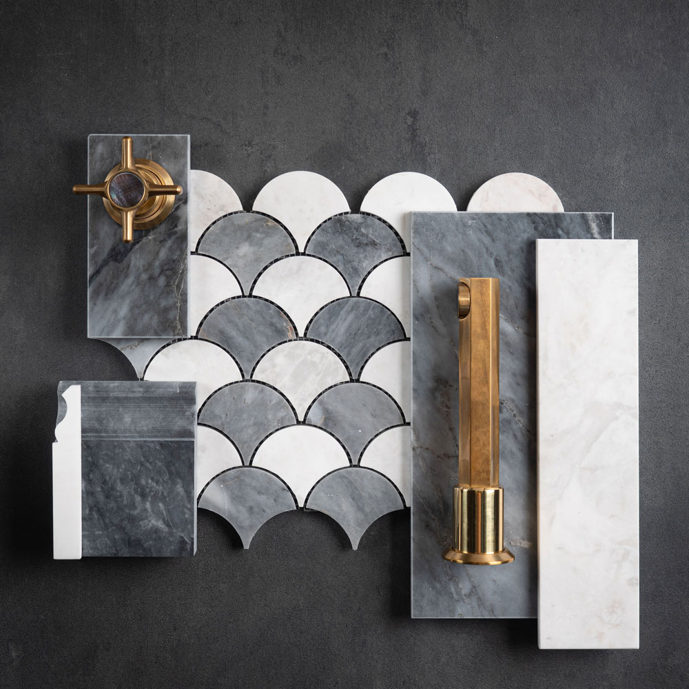 Our new Bluestone & White marble scallop mix features beloved scallop design with alternating grey and white marble scallop pattern. Suitable for bathroom walls and floors as well as wet rooms.