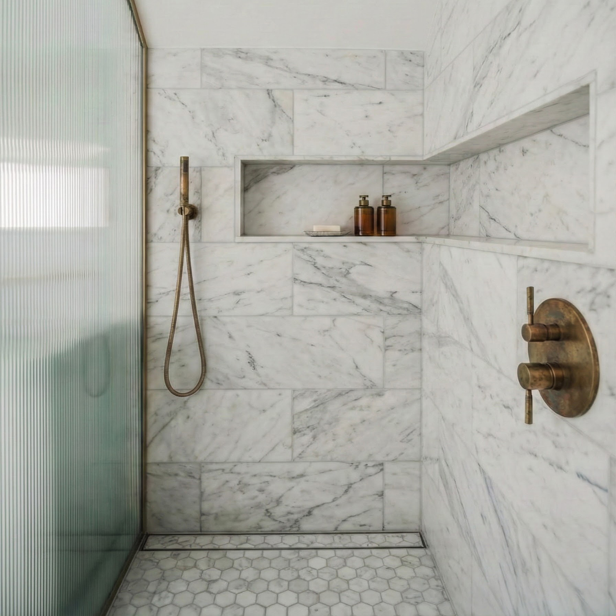 A true interior classic White Marble with soft grey shades has been used for centuries to create an ageless elegance and remains to be popular as ever. Offered in honed and smooth tumbled finishes as well as in different patterns like herringbones and hexagons. Suitable for walls, floors, bathrooms, wet rooms, and underfloor heating. Including but not limited to Clubs/Bars, Restaurants, Lobbies, Hotels, Shops, plus many more. Please note that colours may differ in natural/artificial lighting. Sealing is recommended for all our natural stone products