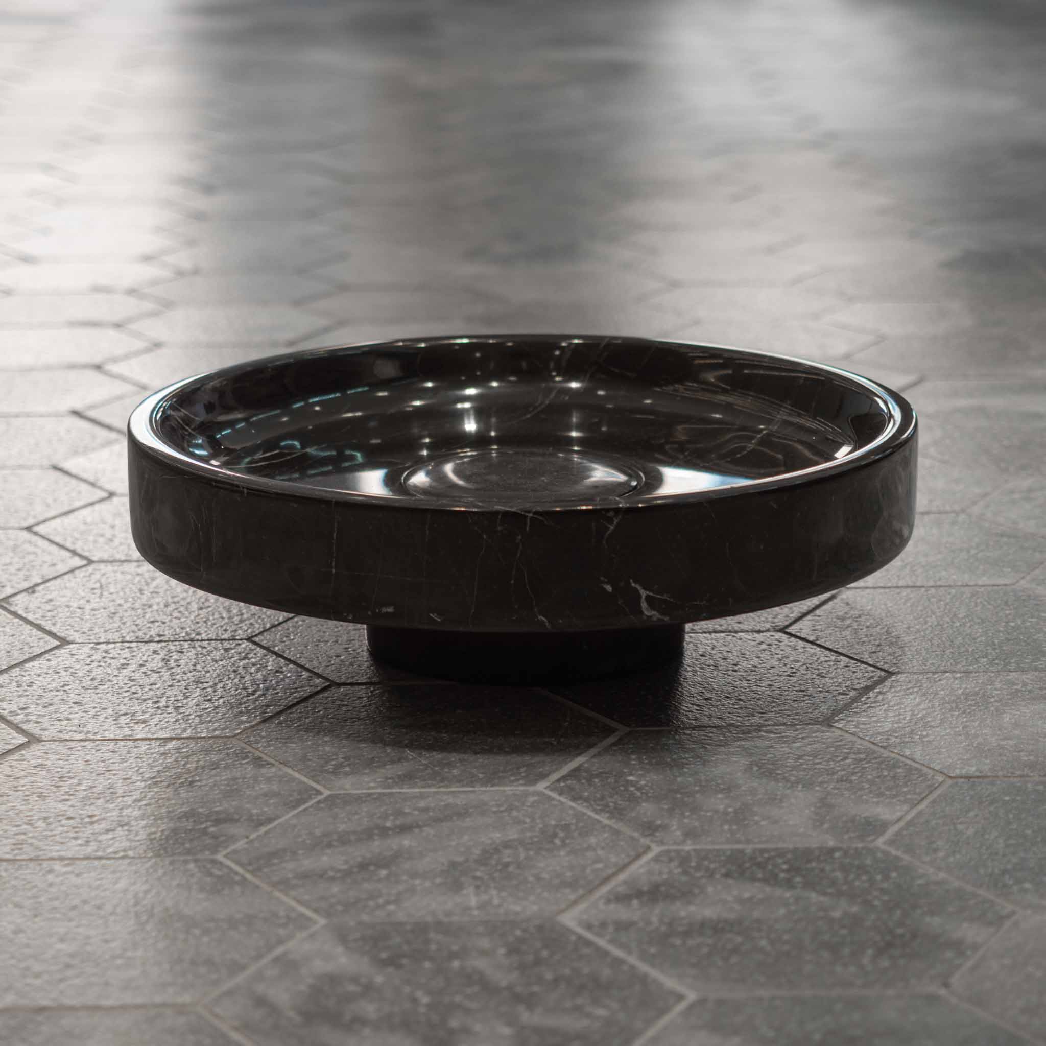 Made from the finest selection of Bluestone Marble, round basin features dark bluish grey marble background with elegant light grey veining. Elegant feature for any wash room and bathroom.