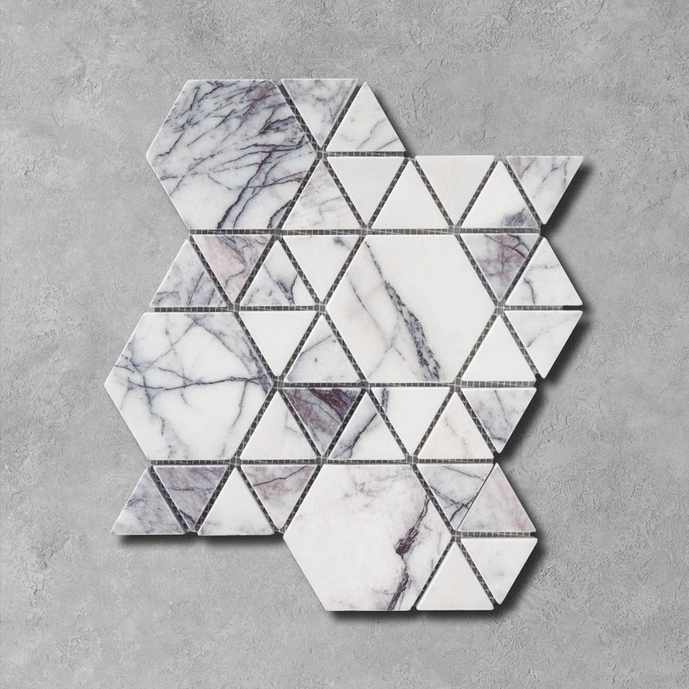 Lilac marble also known as Calacatta Viola is now offered in a large basket mosaic pattern. With large Viola pieces and 10x10mm nero black pieces marble basketweave pattern never been so realistic.
