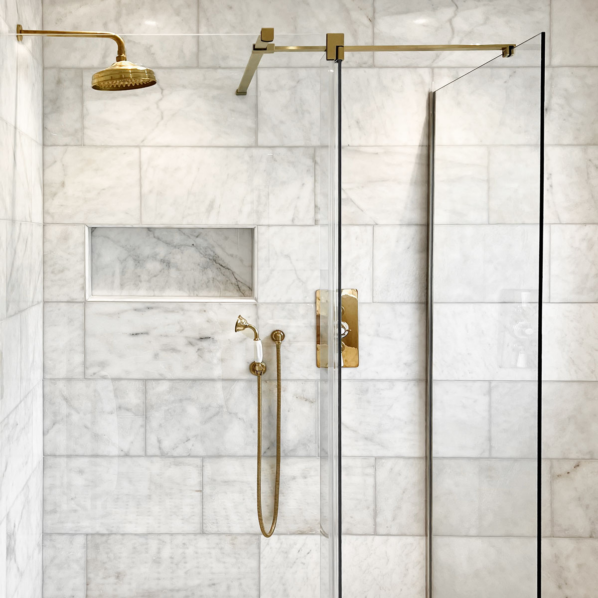 Our extravagant Nero black marble tiles are now available in classic 75x150mm format. Featured here in a contrast display of checkered metro tile pattern combined with Calacatta Metro Tiles.