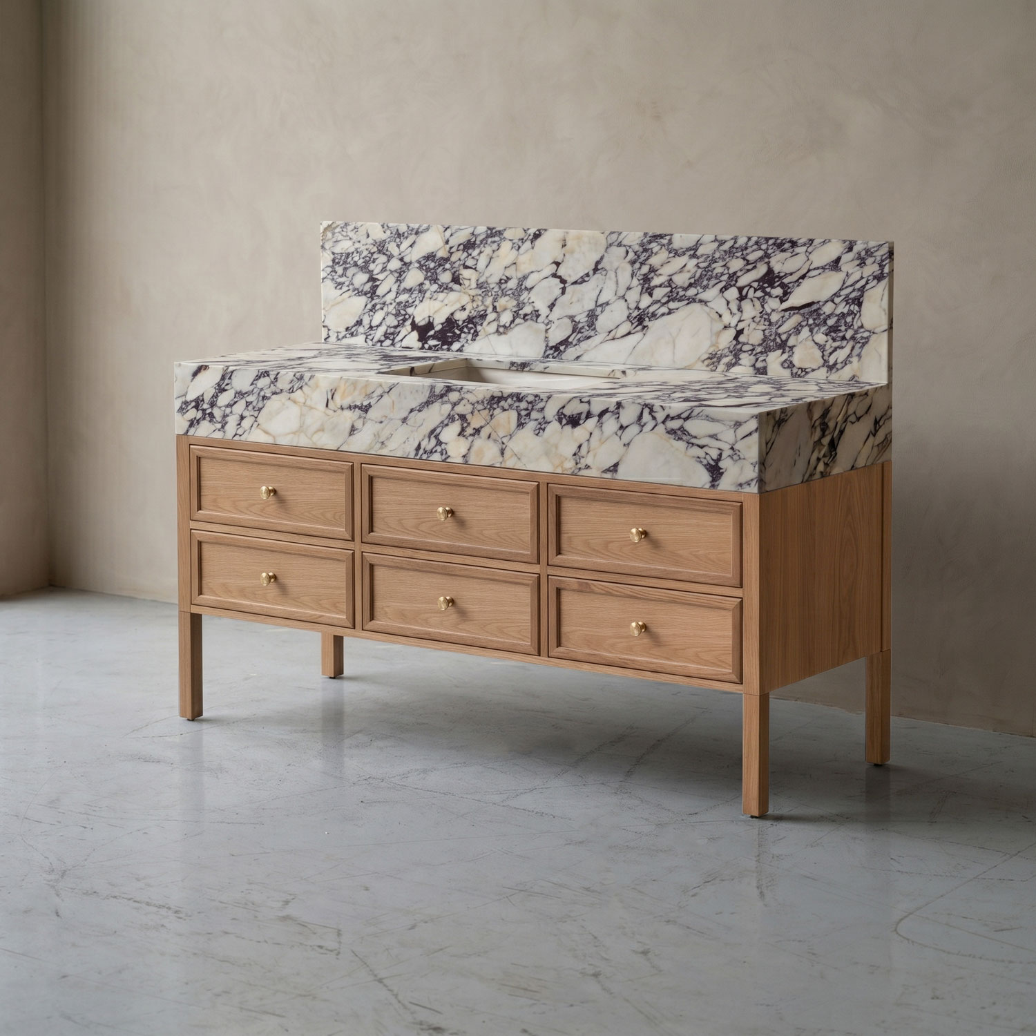 The Roma vanity unit is a harmonious fusion of British design and Italian craftsmanship, embodying elegance and functionality. Made from premium European oak, this piece showcases the warmth and durability of natural wood. The minimalist yet timeless British design reflects a balance between form and practicality, emphasizing clean lines and a modern aesthetic. With four functional doors and a adjustable towel rack inside this unit has all the storage space you need. Contact us to customize your unit with bespoke marble top that can be picked from our Slab Gallery.
